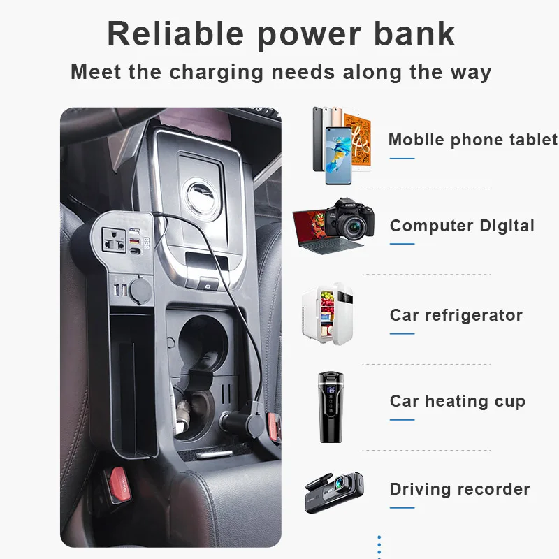 1. A multifunctional car storage box which can store some small stuffs in your car, such as sunglasses, mobile phones, keys or bank cards, to keep the car tidy. 2. Suitable for 12V/24V cars, with multiple types of charging ports, including 3*2.4A USB ports, 1*QC3.0 fast charging USB port, 1*Type-C port, and 1*220V plug (compatible with European regulations, US Regulations and Australian regulations), 1*cigarette lighter interface. 3. LED voltage display function, real-time monitoring of the voltage in the car to prevent the voltage from being too high or too low.
