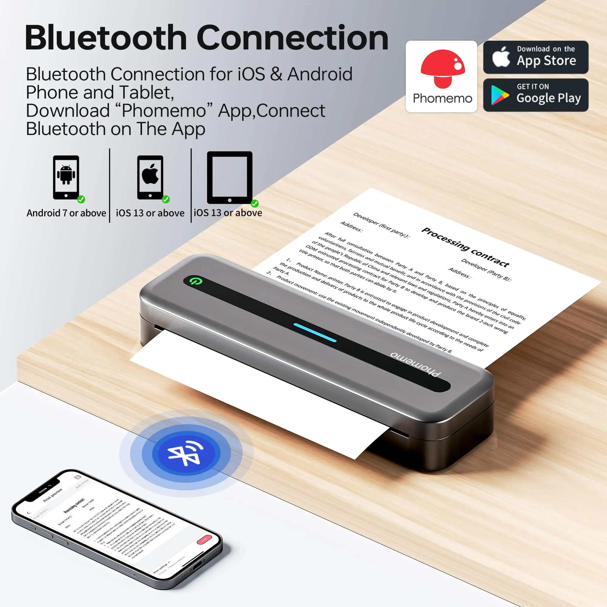 Download The App “Phomemo” on Google Play Or App Store, One Click to Connect The Wireless Printer by Bluetooth (Connect On App Rather Than Phone Directly)