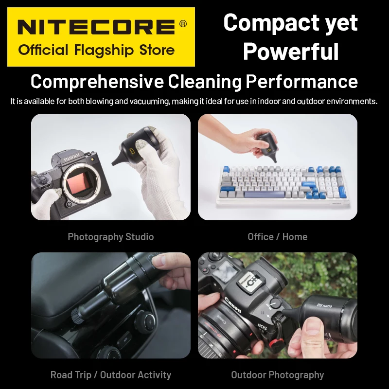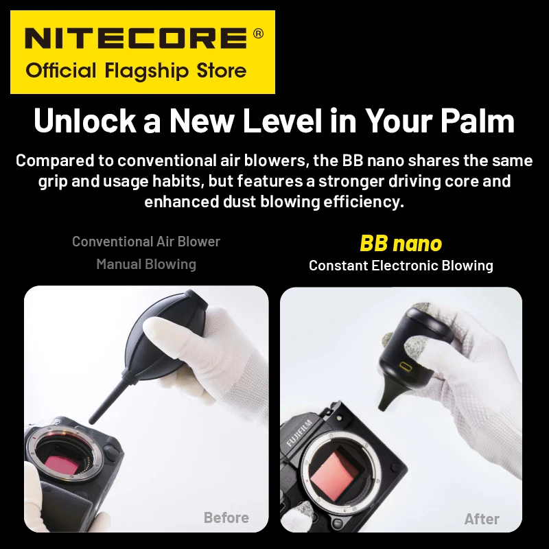 The NITECORE BB nano Portable Versatile Electronic Blower is equipped with a builit-in high power motor and an integrated impeller,featuring a dust removal wind pressure of 2.6 kPa and weighing only 99g (3.49 oz).When used with vacuuming attachments, it caneffectively perform vacuuming.