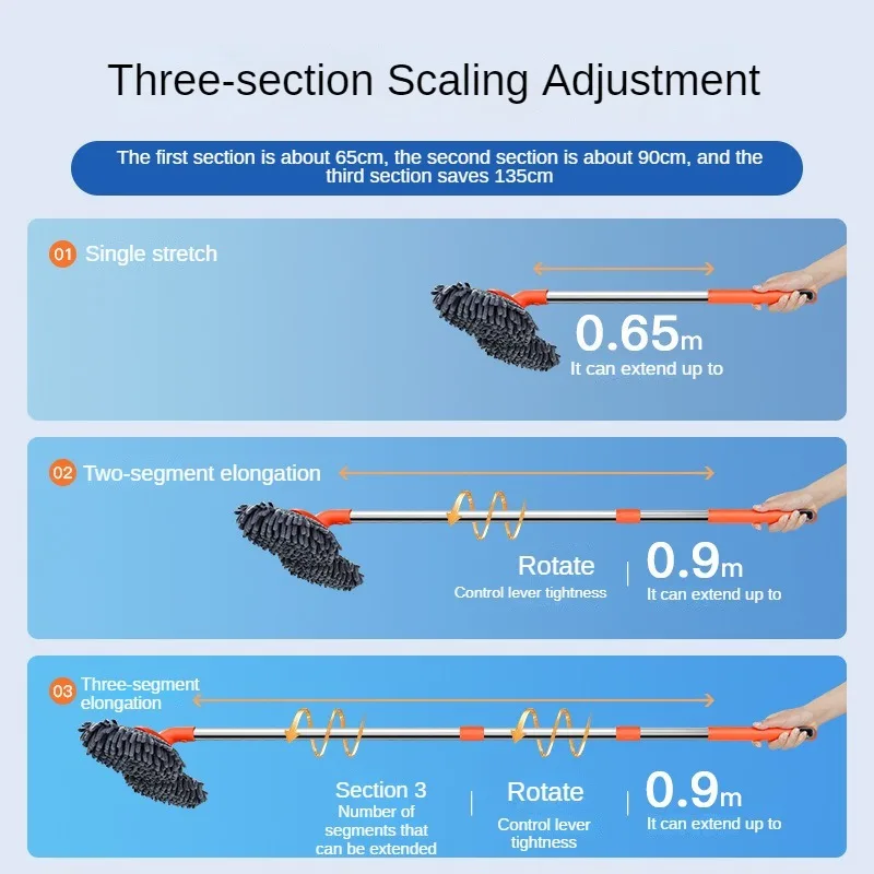 Telescopic Three-Section Handle – Extend and adjust the length to reach car roofs, windshields, and windows with ease, no ladder required.